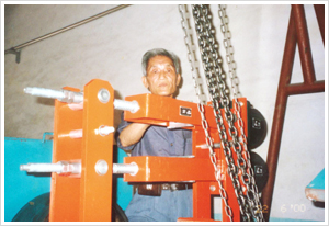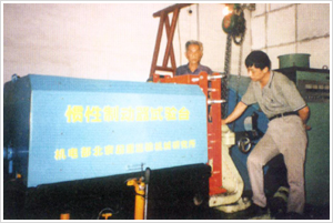 節(jié)能制動(dòng)器創(chuàng)始人張家政先生(左一)在北京起重運(yùn)輸機(jī)械研究所實(shí)驗(yàn)臺(tái)上進(jìn)行檢測